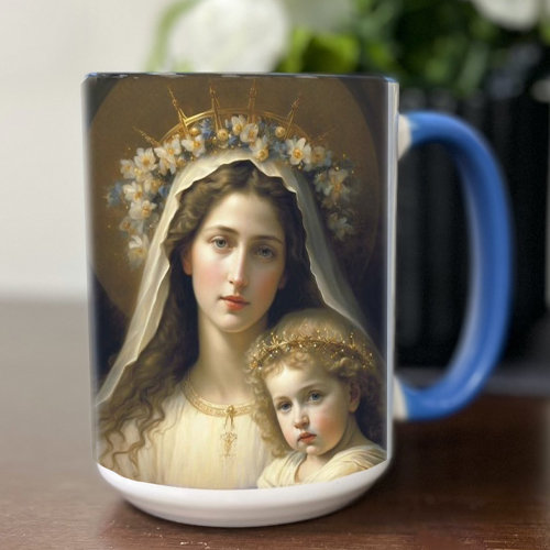 Add a touch of faith to your morning routine with a full colour Blessed Mother mug. This stunning mug features a sweet image of the Christ Child with His Mother and reads, "Holy Mother of God, Pray for us!"