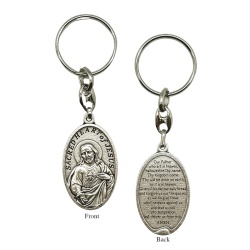 Oval silver oxide keyring cutout of Sacred Heart of Jesus with the Our Father prayer on the back.