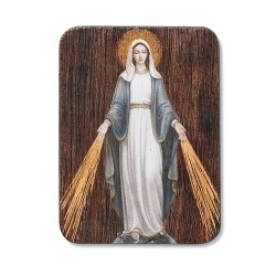 This picture of Our Lady of Grace has a texted wood finish with gold highlights throughout the picture. A key hole point for hanging on a wall is 1" (2.5cm) from the back top.
