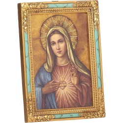 This beautiful image of the Immaculate Heart of Mary is printed with a metallic sheen on medium weight fiberboard (MDF) and is 3 dimensionally framed in a turquoise and gold resin frame.