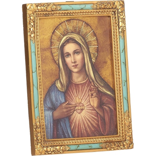 This beautiful image of the Immaculate Heart of Mary is printed with a metallic sheen on medium weight fiberboard (MDF) and is 3 dimensionally framed in a turquoise and gold resin frame.