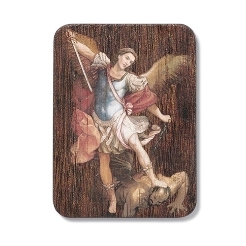 This picture of St Michael the Archangel has a texted wood finish with gold highlights throughout the picture. A key hole point for hanging on a wall is 1" (2.5cm) from the back top.